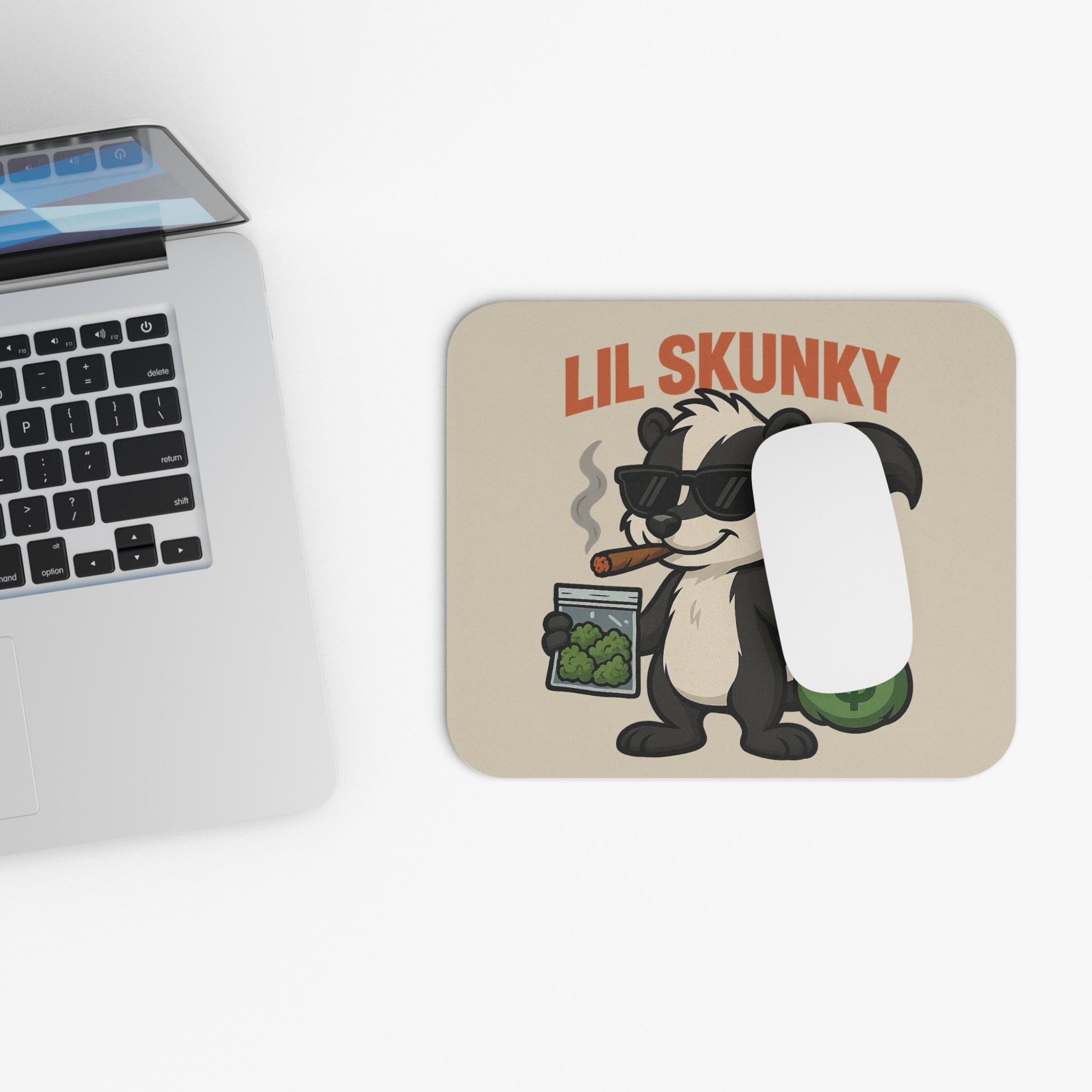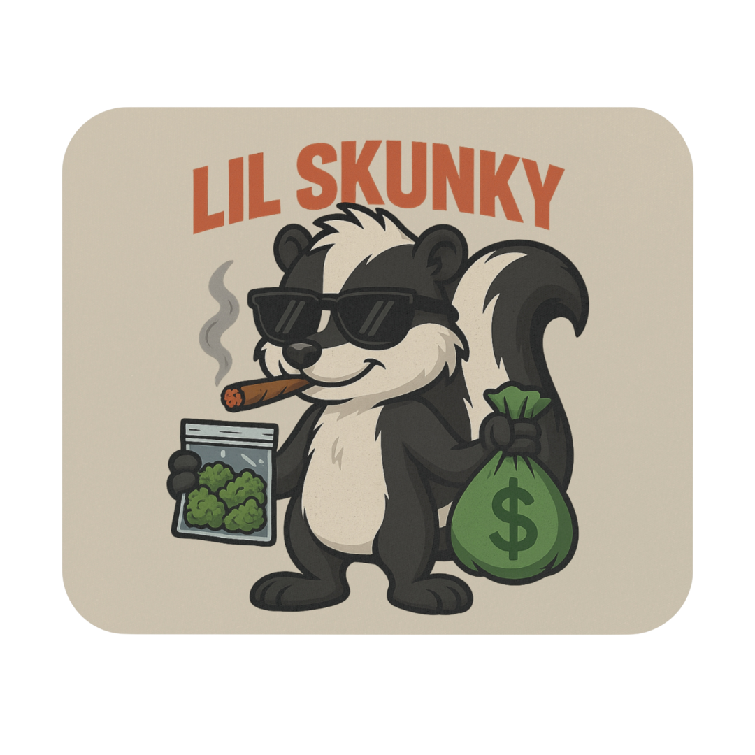 Upgrade your setup with high vibes and higher standards. The Lil Skunky Kush & Cash Mouse Pad / Dab Mat features our iconic shades-wearing skunk puffing a slow-burning blunt while holding a fat bag of sticky Kush nugs in one hand and a stuffed sack of cash in the other. It’s the ultimate tribute to the grind, the hustle, and the herb.