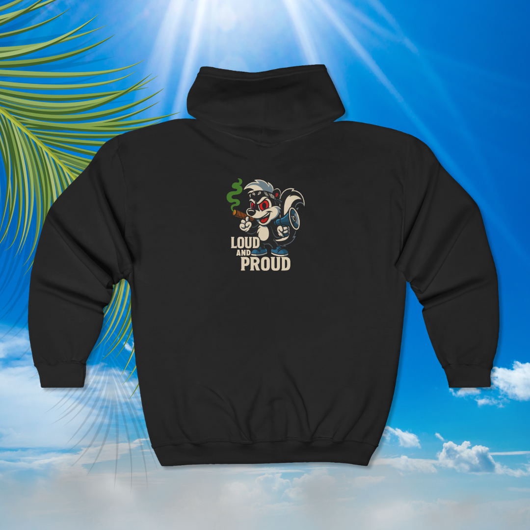 Show the world your energy with the official Lil Skunky “Loud and Proud” Hoodie – featuring our signature skunk mascot gripping a megaphone in one hand and cigar in the other. This design is bold, unapologetic, and guaranteed to turn heads anywhere you go.